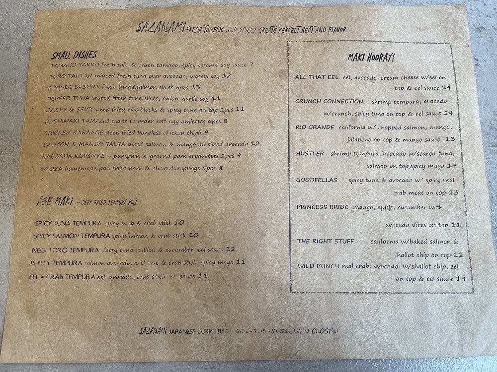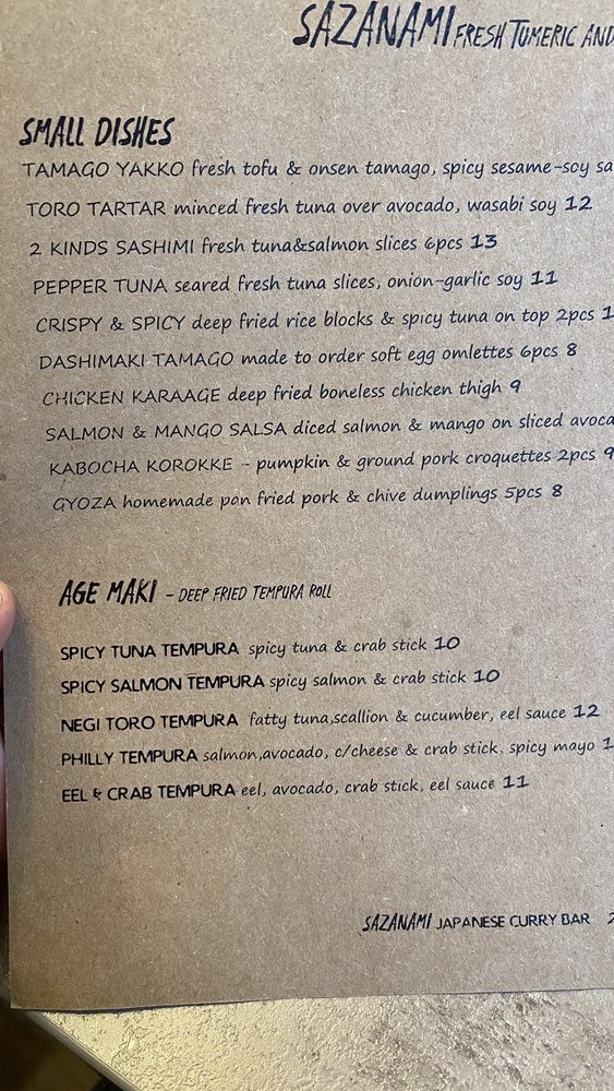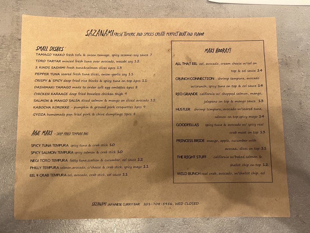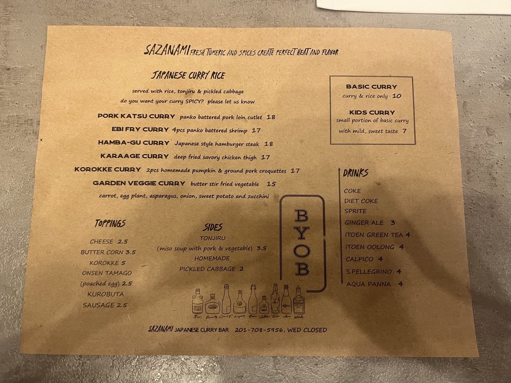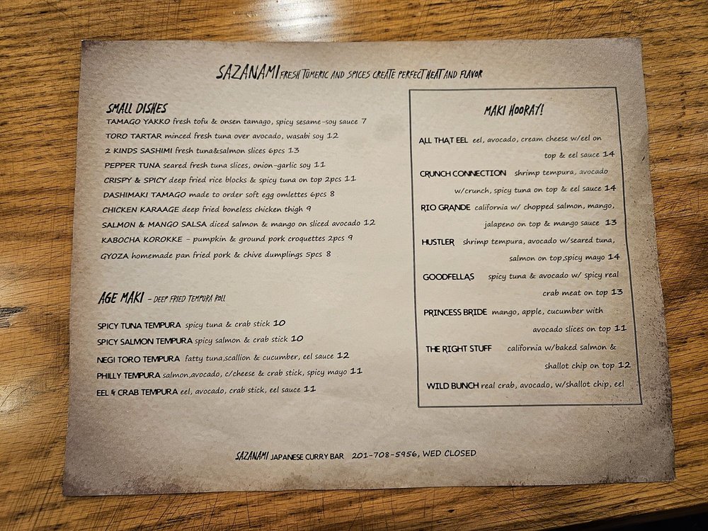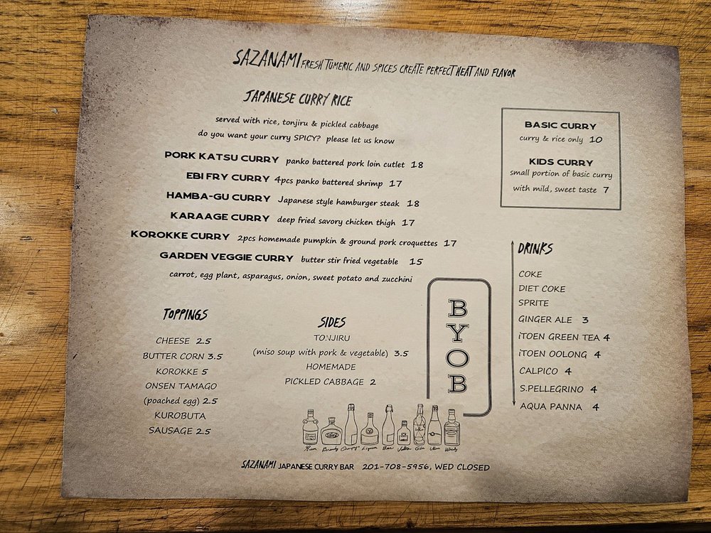 Introducing the menu at Sazanami, a Japanese Curry - Sushi Bars establishment located at 400 Main St Fort Lee, NJ 07024. This trendy restaurant offers a variety of curry rice sets like Pork Katsu Curry and Garden Veggie Curry, as well as starters like Spicy Tuna Crispy Sushi and Chicken Karaage. Customers rave about the delicious food, with reviews praising the Katsu, curry dishes, and juicy Chicken Karaage. The cozy ambiance and attentive service add to the dining experience. Don't miss out on the must-try dishes like the Ebi Fry Curry and pumpkin croquettes. Sazanami is a gem in Fort Lee, providing high-quality, budget-friendly meals perfect for any occasion.