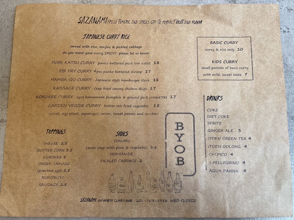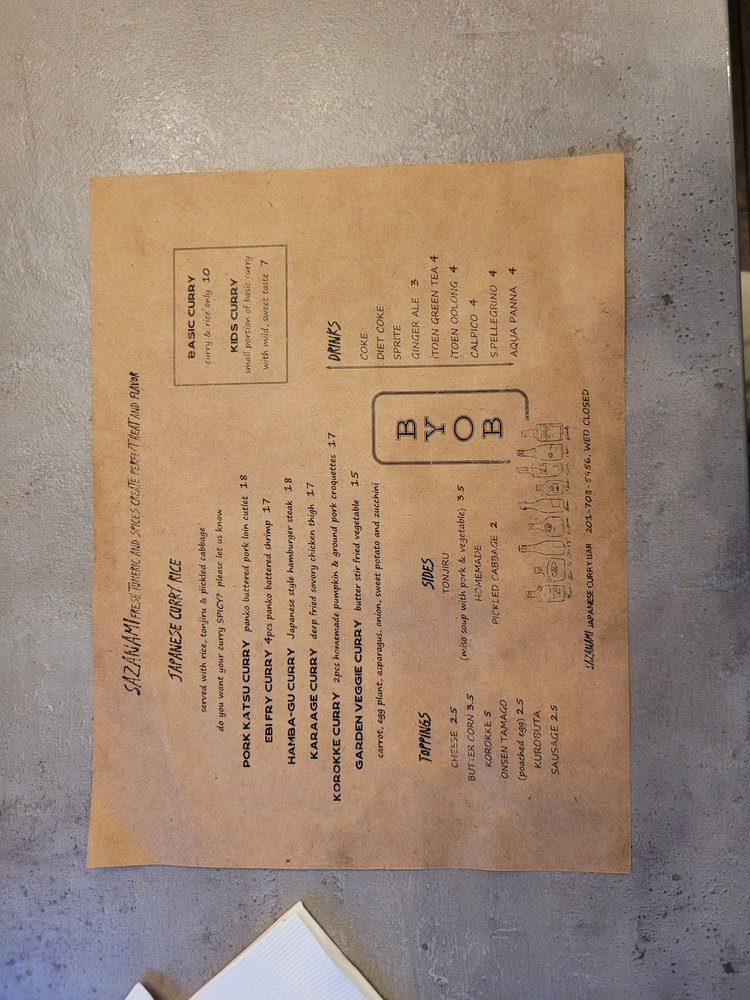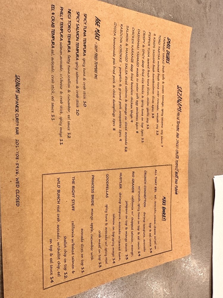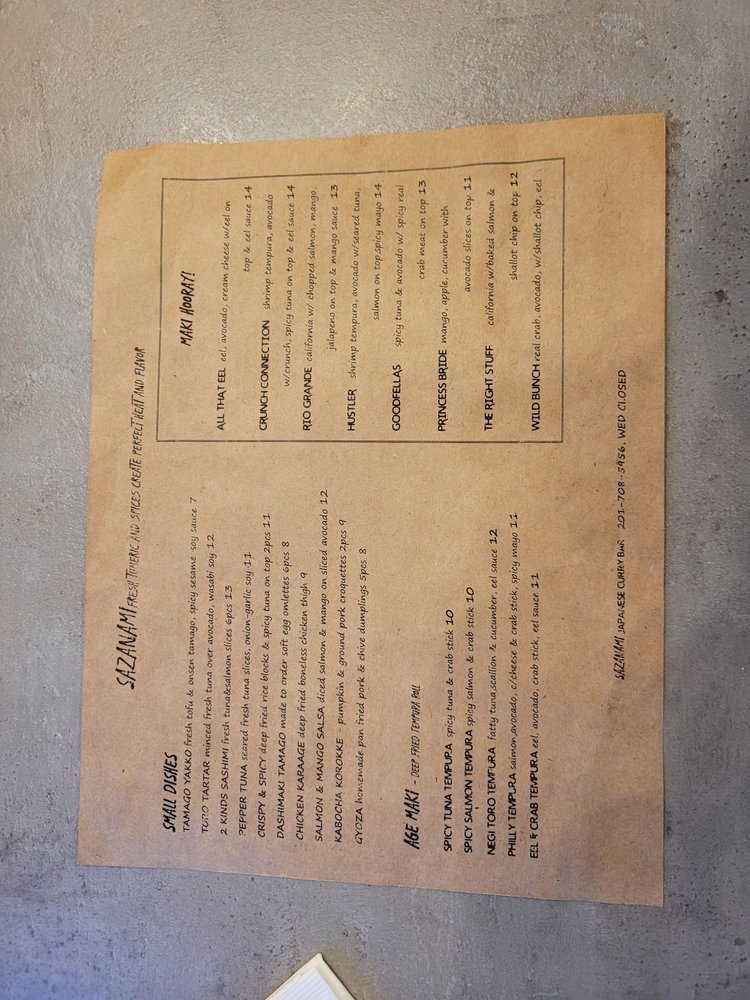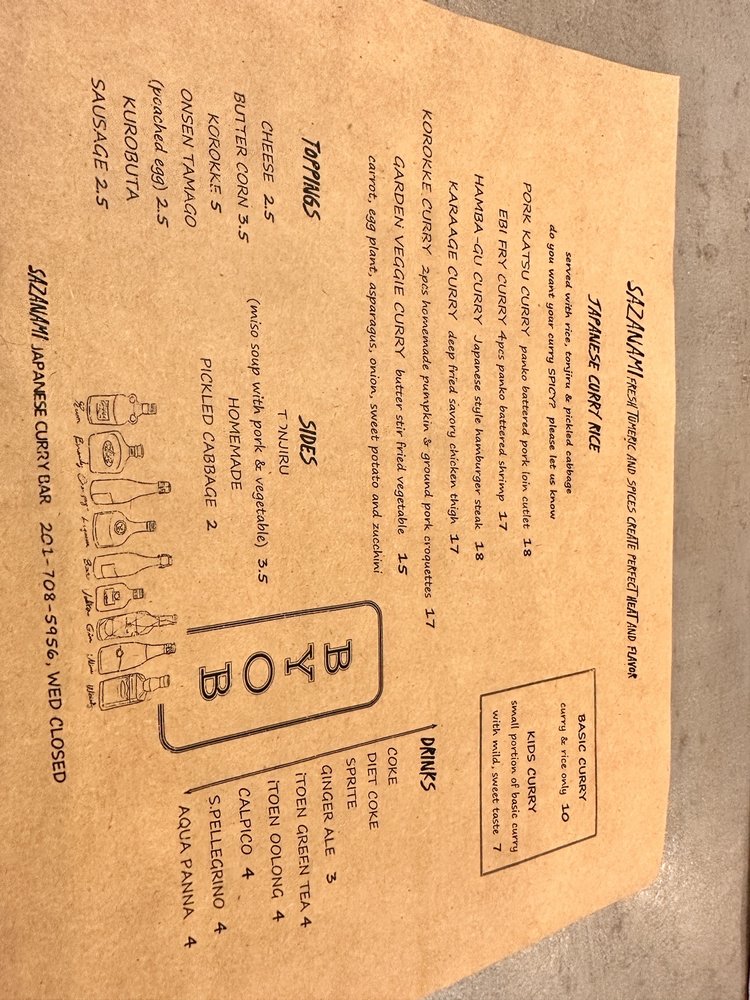 Introducing the menu at Sazanami, a Japanese Curry - Sushi Bars establishment located at 400 Main St Fort Lee, NJ 07024. This trendy restaurant offers a variety of curry rice sets like Pork Katsu Curry and Garden Veggie Curry, as well as starters like Spicy Tuna Crispy Sushi and Chicken Karaage. Customers rave about the delicious food, with reviews praising the Katsu, curry dishes, and juicy Chicken Karaage. The cozy ambiance and attentive service add to the dining experience. Don't miss out on the must-try dishes like the Ebi Fry Curry and pumpkin croquettes. Sazanami is a gem in Fort Lee, providing high-quality, budget-friendly meals perfect for any occasion.